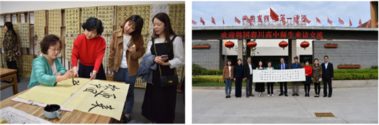 韩国春川高中是江原道的一所知名男校,2019年5月8日下午,该校师生对学校进行来访,他们参观了学校各类设施建设,随行领导、老师与学校图书室韩思雨老师切磋中国书法,并对学校文化建设和办学成绩给予高度评价。