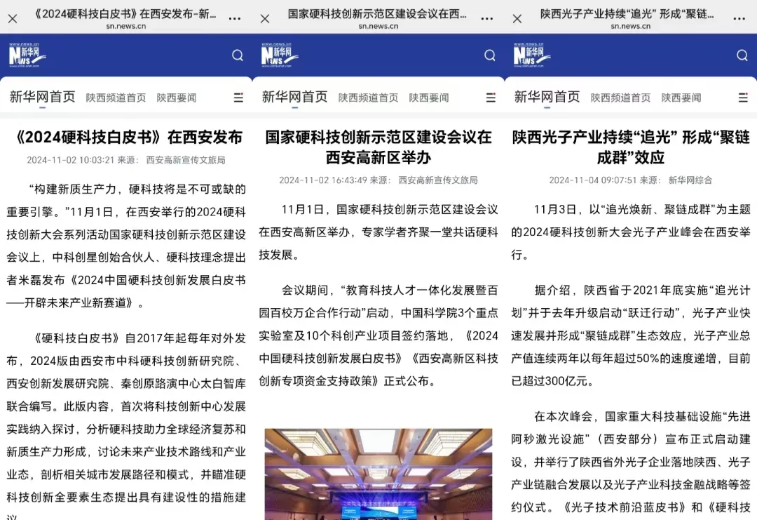 新华网连续三次聚焦西安高新区,分别刊发以《《2024硬科技白皮书》在西安发布》《国家硬科技创新示范区建设会议在西安高新区举办》《陕西光子产业持续“追光” 形成“聚链成群”效应》为题的文章,深入展现西安高新区科技创新的充沛活力。