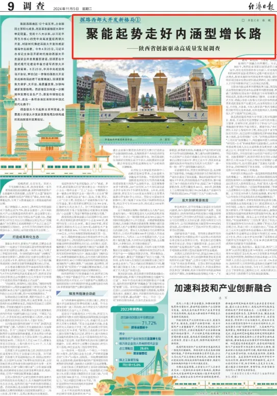 经济日报今日9版刊登《聚能起势走好内涵内涵型增长路——陕西省创新驱动高质量发展调查》整版报道,其中大量引用西安高新区案例。