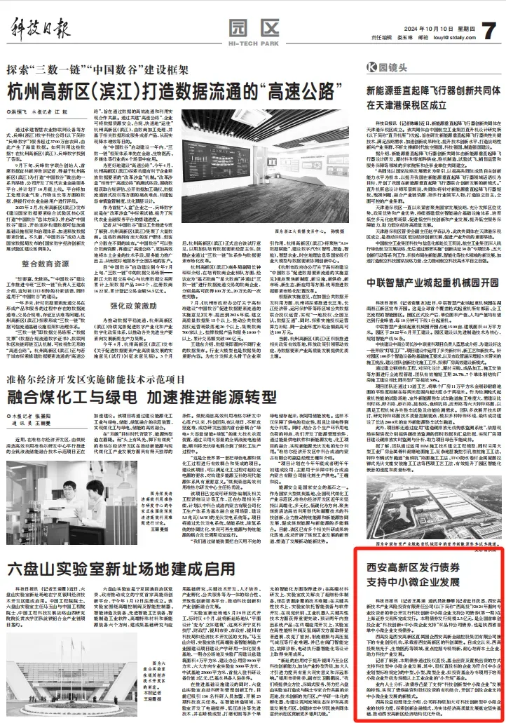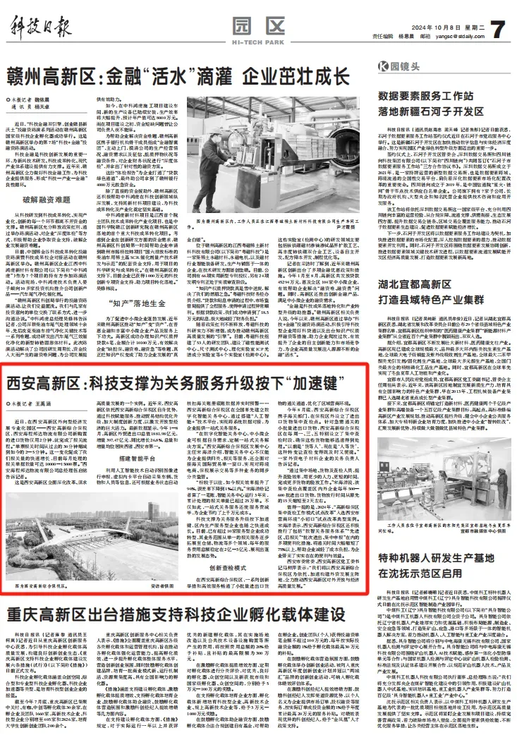 10月以来,科技日报连续6次聚焦西安高新区,刊发了以《“硬科技”策源地彰显硬实力——写在2024硬科技创新大会即将开幕之际》《全球首个乙肝靶向创新药获批上市》为题的文章,同时聚焦“科技赋能服务”、“中小微企业支持债券”、“空天动力创新中心项目建设”、“农业科技发展”等内容持续报道高新区,充分展现西安高新区在科技创新和生物医药领域发展的澎湃活力。
