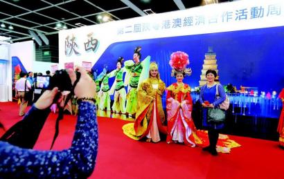 11月21日,香港会展中心,参会嘉宾与“唐明皇”、“杨贵妃”合影。连日来,第二届陕粤港澳经济合作活动周系列活动在香港如火如荼进行,活动现场充满了浓郁的三秦特色,众多的招商项目更是吸引了众多香港客商和嘉宾积极参会,洽谈合作。
