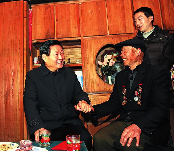 2月11日,省委书记赵正永深入咸阳市旬邑县看望困难群众和优抚对象。图为他在赤道社区义井村看望慰问抗战老战士肖思勤及家人。 本报记者 宋红梅 摄