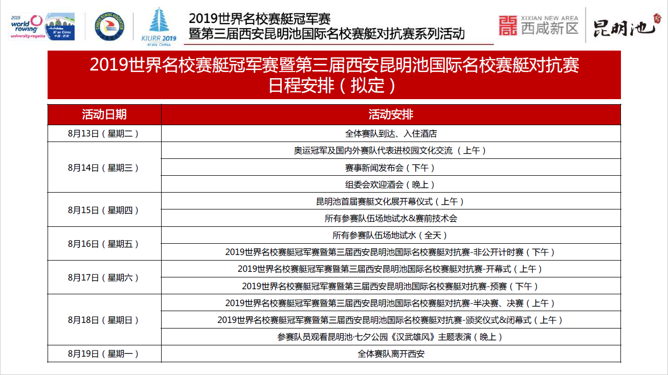 为了落实省市领导对发展赛艇运动的指示精神,提升昆明池的旅游品牌形象,促进国际文化交流,吸引国际化人才,助力推进西安国家中心城市的建设, 今年,经过组委会及赛事机构的多方努力与确认,国际赛艇联合会与中国赛艇协会已经成为品牌赛事的合作方,并将该赛事升级为国际赛艇联合会的世界名校赛艇冠军赛系列赛的重要组成部分。升级之后的2019世界名校赛艇冠军赛暨第三届西安昆明池国际名校赛艇对抗赛将邀请来自国内外的20所知名高校的30支队伍, 包括20支男队和10支女队,进行男子、女子八人单桨有舵手800米直道竞速两个项目的比赛。他们分别为:德国法兰克福大学、美国哈佛大学、俄罗斯圣彼得堡大学、荷兰阿姆斯特丹大学、英国剑桥大学、意大利米兰大学、英国诺丁汉大学、英国牛津大学、瑞士苏黎世大学、美国耶鲁大学、北京大学、上海交通大学、同济大学、清华大学、西安交通大学、西安电子科技大学、浙江大学、中国文化大学、香港高校联队、澳门大学.30支队伍将在昆明池上展开为期两天的麋战,经过预赛、四分之一决赛、半决赛和决赛的角逐,最终决出男子组和女子组两个组别的冠亚季军。