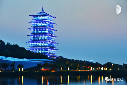 夜幕下,蓝色灯光装点的长安塔与一轮明月交相辉映,诉说着西安世园会的盛况,映射着西安这座古老城市的变化。