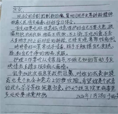 京京年龄虽小,但在同事们眼中,不光工作表现突出,还是个孝顺的好孩子。她从小和爷爷奶奶感情甚好,两位老人生病住院,她跑前跑后,端茶送饭,体贴照顾,下夜班不休息陪护着老人家,爷爷奶奶逢人便夸京京是个孝顺的宝贝孙女。2020年春节前夕,全国新型冠状病毒肺炎疫情防控形势严峻,按照省卫健委的部署,要求西安交大二附院组建第一批支援武汉的医疗队。疫情当前,刻不容缓,通知一经发出,呼吸与危重症医学科多名医务人员踊跃报名,积极响应,其中阎京京护士就是第一个给护士长主动请缨的逆行者。最终科室精选出由阎京京在内的4人组成政治强、业务精、综合素质高的出征团队。京京害怕88岁高龄的爷爷担心,出发前没有将自己要出征武汉的消息告诉爷爷。当爷爷两天后在新闻上得知自己疼爱的孙女已经冲到了援鄂一线,老人家再也坐不住了,亲手写下“希望你是个优秀的战士,爷爷等你健康归来”的家书寄给京京,一封家书,见字如面,叮嘱她努力工作,做好防护,一定要平安归来。字里行间,饱含担心与不舍,充满鼓励与嘱托。