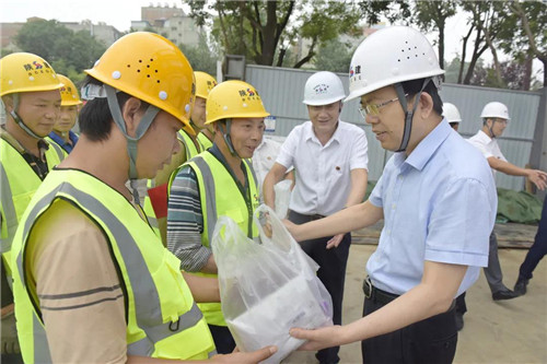 在施工现场,张义光听取了项目规划和施工准备及建设情况的汇报,察看了何家营地铁站施工情况,慰问了现场施工人员,给他们送上了防暑降温品,并嘱咐项目部要用心照顾好现场施工人员的生活,合理安排作业时间,确保他们安全健康工作。