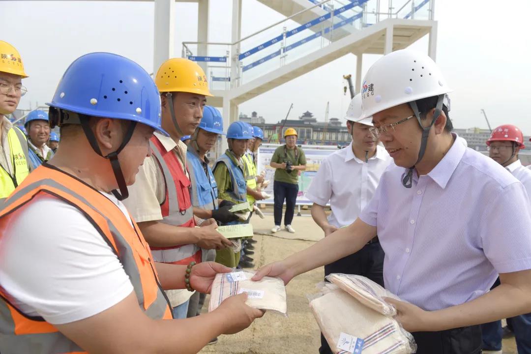 7月20日,陕建集团党委书记、董事长张义光率队到西安火车站北广场项目调研,慰问一线施工人员。他强调,要切实做好防暑降温和后勤保障工作,确保工人们的身体健康和施工安全,要采取科学有效措施,保质保量加快项目建设,向西安人民交一份满意答卷。