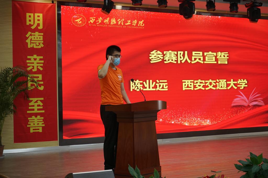 随后,西安交通大学陈业远同学代表参赛队员宣誓,西安邮电大学周元哲老师代表教练员讲话,长安大学荆树旭老师代表竞赛裁判员宣誓。