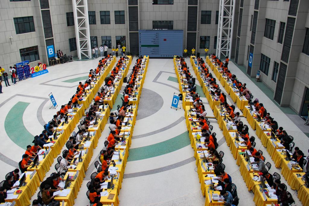 9月26日上午11:00,比赛在明心楼中厅正式开始。比赛规定每支参赛队由3名在校大学生组成,每队使用1台计算机解决复杂的编程问题。在比赛过程中,现场大屏幕实时公布所有队伍的进展情况,同时通过气球的颜色和个数,可以了解到身边其他参赛队伍的答题情况,这也考验着参赛选手的现场抗压能力。