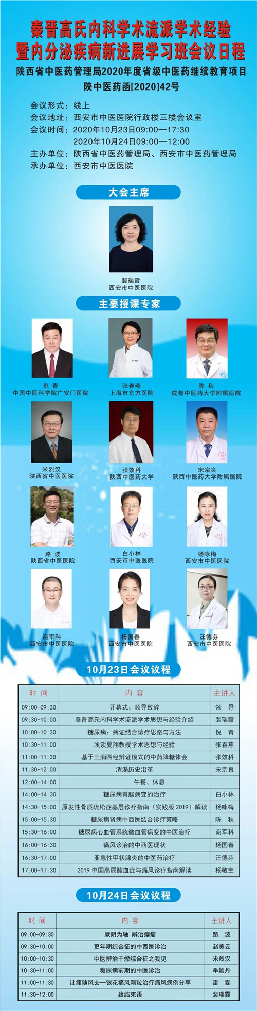 为了传播中医药传统文化,提高中医药服务能力,扩大中医流派的影响力,我院将与陕西省中医药管理局、西安市中医药管理局联合举办“秦晋高氏内科学术流派学术经验暨内分泌疾病新进展学习班”,陕中医药函(2020)42号,项目编号:SC2020006。学习班定于2020年10月23日-10月24日举办。本次学习班将邀请国内多名内分泌领域知名专家进行学术讲座,欢迎大家按时参会交流。会议信息如下: