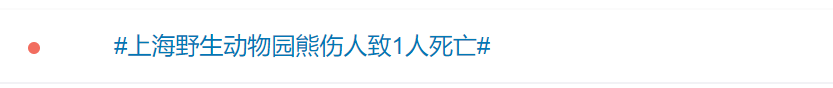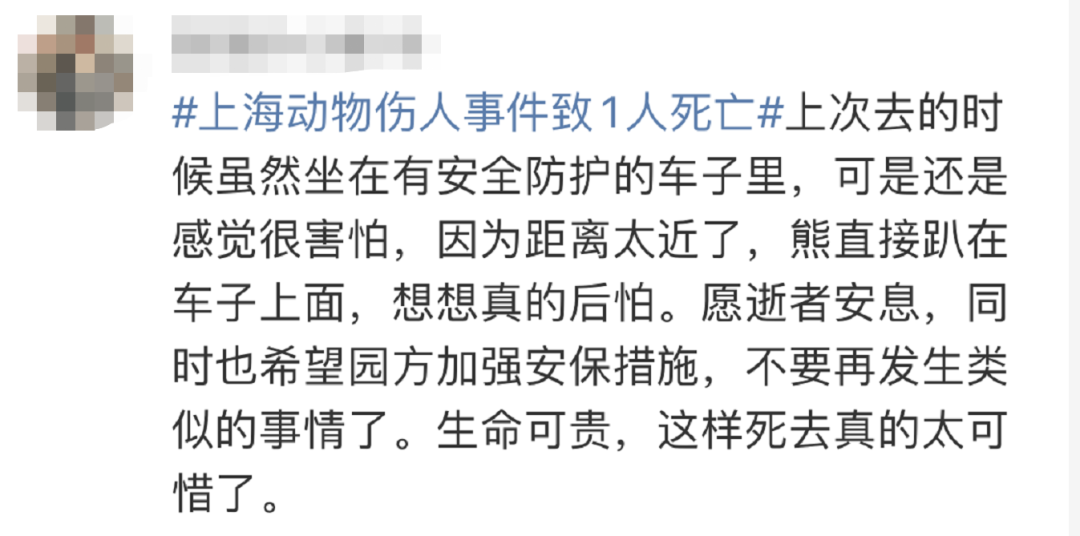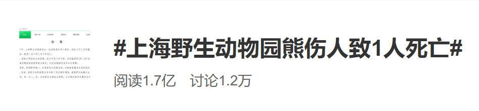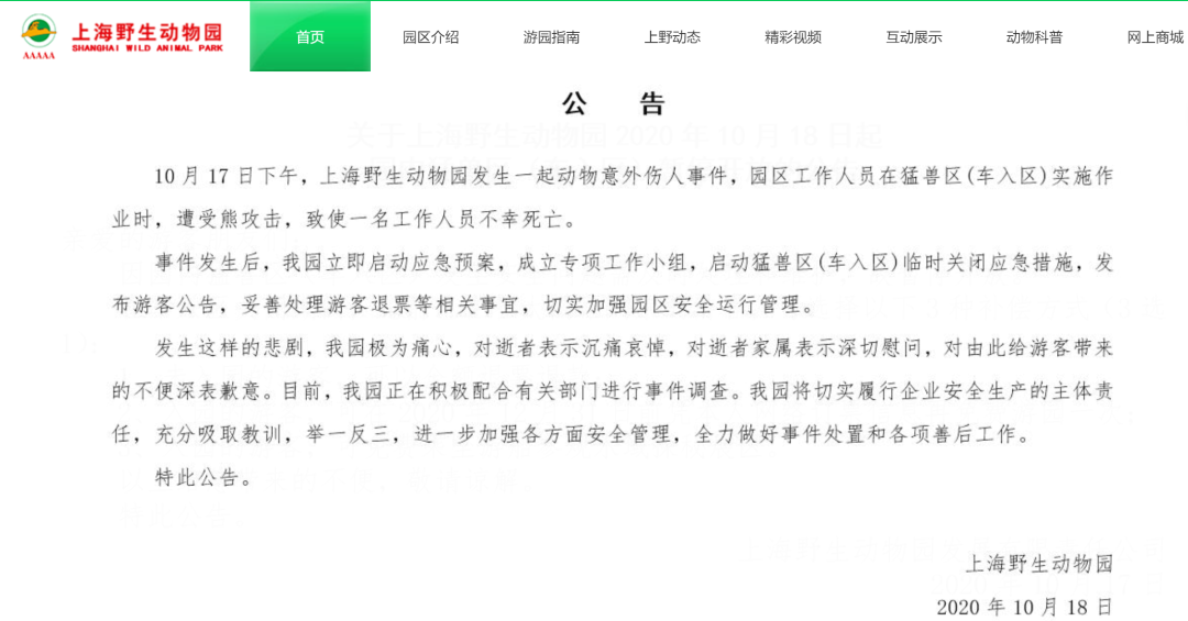 10月17日下午,上海野生动物园发生一起动物意外伤人事件,园区工作人员在猛兽区(车入区)实施作业时,遭受熊攻击, 致使一名工作人员不幸死亡 。