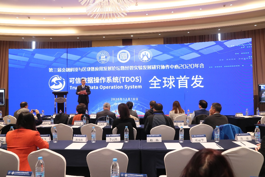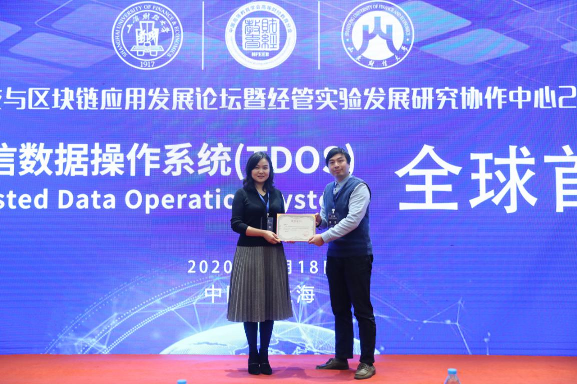 本次会议上,由上海财经大学金融科技研究院和常州市勇阳信息技术有限公司联合研发的新一代区块链技术产品——TDOS(2.0)可信数据操作系统正式发布。丝路融媒体发展有限公司与上海财经大学达成战略合作,在TDOS环境下联合研究开发相关应用场景的技术产品。