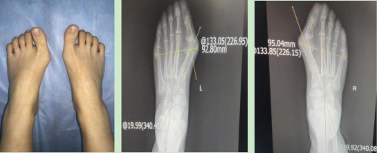 术前:左足HVA=46.95°,IMA = 19.59°右足HVA=46.15°,IMA = 19.92°