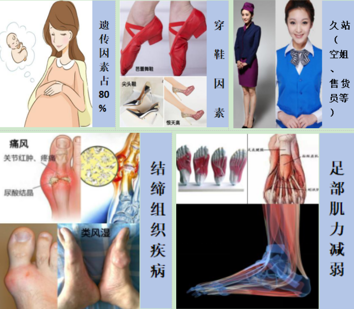 注:需要注意的是穿鞋并不是导致踇外翻的唯一原因,可能会使那些具有潜在骨或软组织异常的人加重畸形,促进了踇外翻足的某些病理改变。