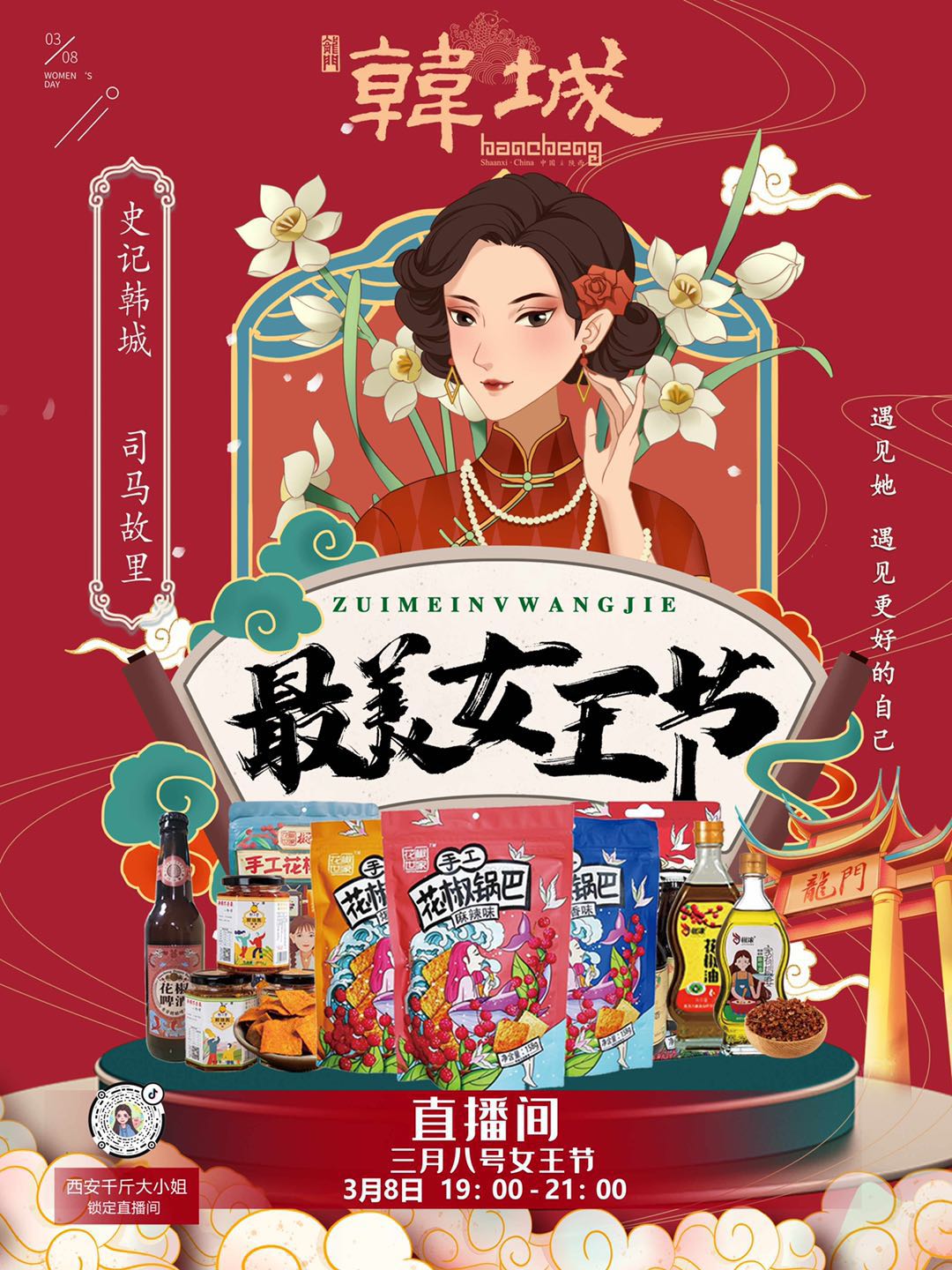 现代女性,敢于拒绝千篇一律的人生,坚定而勇敢的活出自己的风采。时值第111个“三八国际妇女节”来临之际,韩城市龙门国际集团邀请百万粉丝达人“西安千斤大小姐”于3月8日晚19:00-21:00期间,特举办“‘你好•女王’韩城市特色商品直播节”专场活动。