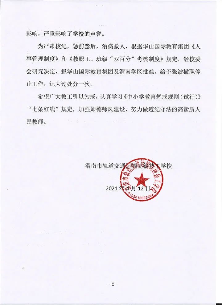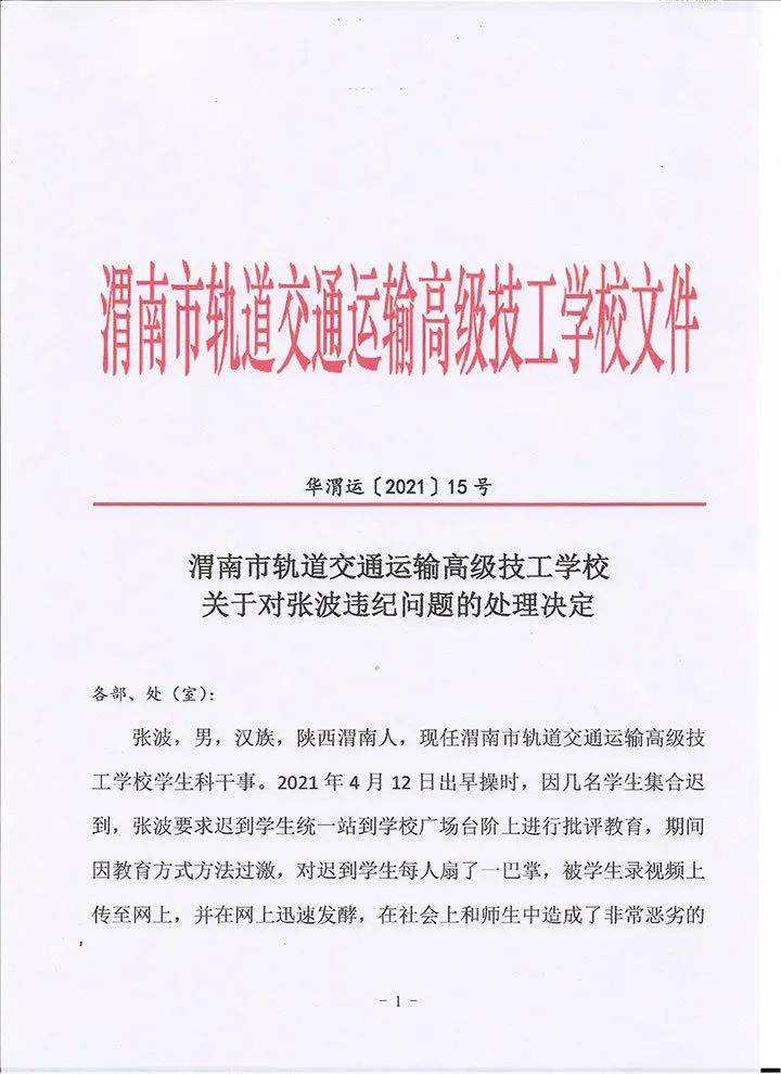 涉事教师张波,男,汉族,陕西渭南人,事发时任渭南市轨道交通运输高级技工学校学生科干事。2021年4月12日出早操时,因几名学生集合迟到,张波要求迟到学生统一站到学生广场台阶上进行批评教育,对迟到学生每人扇了一巴掌。