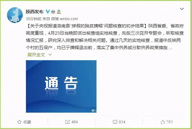 通报称,关于央视报道洛南县“掺假的脱贫摘帽”问题,陕西省委、省政府高度重视,4月23日当晚即派出核查组实地核查,先后三次召开专题会,听取核查情况汇报,研究深入排查和解决相关问题。