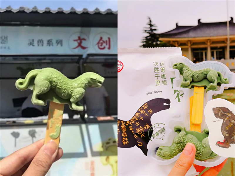 今年五一期间“三星堆出品青铜面具冰淇淋”登上热搜,五一当天上新了1200多根“青铜面具”冰淇淋,一上午便销售一空。绿色的抹茶味、黑色的巧克力味,咬一口刚刚出土的青铜面具,也算是近距离与千年文物接触了!
