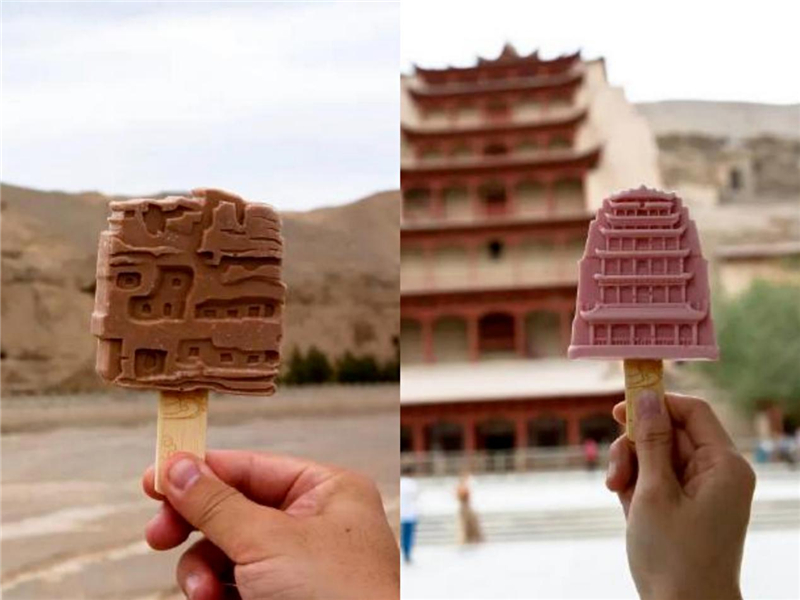 1654岁的莫高窟今夏推出了网红文创雪糕,“草莓九层楼”、“巧克力石窟外景”“奶油月牙泉”。吃完雪糕后的雪糕棒,清洗后就是一枚精美的定制版九色鹿,十分有创意。你想来试试把莫高窟吃进肚子里吗?