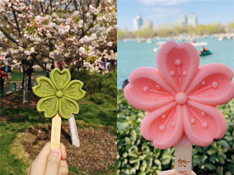 从2019年起,北京玉渊潭公园推出了樱花雪糕。不仅造型绝美,口味还很丰富,颜色有樱花粉、淡黄色,绿色……对应草莓、酸奶、抹茶、香草各种口味。在掌心中感受樱花之美,还可以品尝樱花造型雪糕。