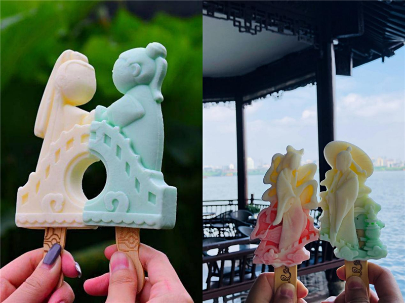 杭州西湖风景区推出的冰淇淋款式有三潭印月、断桥相会、灵隐荷花,甚至连西湖小萌宠松鼠都有同款冰淇淋,好吃好看又好玩。“断桥相会”款的原型,还原了白娘子和许仙在断桥相会的场景。白色女款是白娘子,绿款男款是许仙。情侣们买上一对,你一半,我一半,合起来才是圆满。这种方式,瞬间让吃冰变得甜蜜有趣起来。
