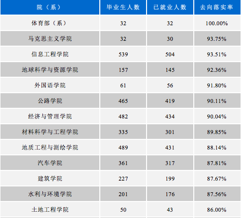 毕业研究生:分院(系)来看,有9个院(系)的毕业生去向落实率超过本校毕业研究生平均水平;其中汽车学院、信息工程学院、电子与控制工程学院去向落实率均在99.00%以上;分专业来看,有38个博士专业和46个硕士专业的毕业生去向落实率达到了100.00%。