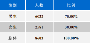 学校2020届毕业生中,男生6022人(70.00%),女生2581人(30.00%),男女性别比为2.33:1。