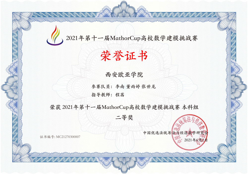 第十一届MathorCup高校数学建模挑战赛于2021年6月4日公示获奖名单,西安欧亚学院金融分院共有7支队伍参加竞赛,都来自数据科学与大数据技术专业在四位老师的带队下,七支队伍中有四支队伍荣获全国二等奖,两支队伍荣获全国三等奖,取得优异成绩。