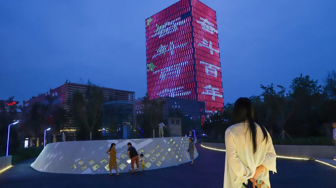 每当夜幕降临、华灯初上,起步区一期的楼体玻璃幕墙上“热烈庆祝中国共产党成立100周年”“学党史 悟思想 办实事 开新局”等红色宣传标语滚动亮化播放,流光溢彩的璀璨灯光秀成为园区的靓丽风景线照亮夜空。