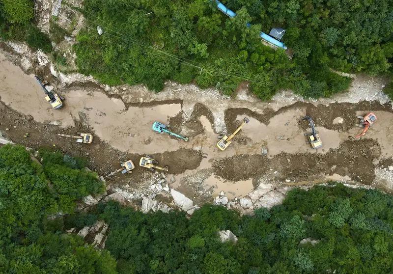 “车走不成了,前面有些路面、路基都被冲毁了,便道还有没通的地方。”上午11时许,按照现场施工人员的指挥,跟随西安公路管理局工作人员改为步行前往大型机械作业面,不一会儿,机器的轰鸣声传来,一处开阔的河道内,8根涵管两两相接连成4条河流通道,施工人员正将铅丝笼围拢在涵管周边,一台挖掘机则将石块投入铅丝笼内。12时许,流峪飞峡景点处再向南的便道还未压实,通过无人机,可以看到前方10余台挖掘机正在紧张作业。