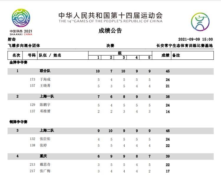 奥运联合队组合于海成/王晓菁以45中的成绩摘得金牌,上海一队组合陈鹏宇/邓维贇和上海二队组合张臣佑/张婷分别以38中和46中的成绩摘得银牌和铜牌。