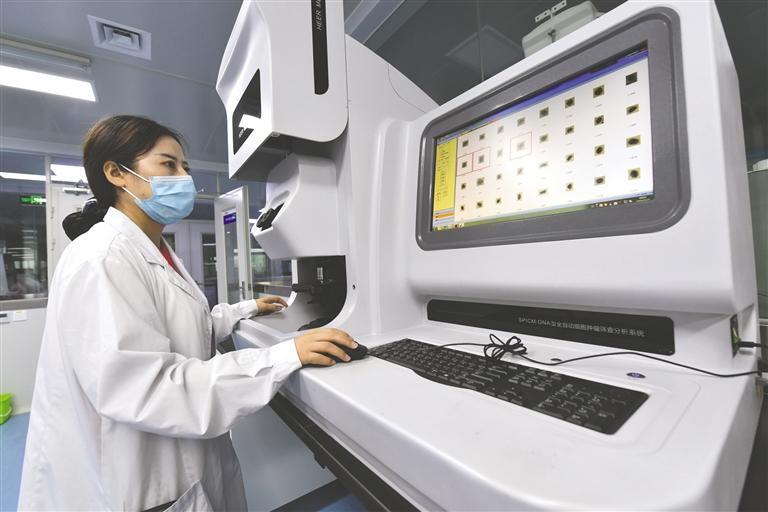 在沣东新城协同创新港,中西部地区检测规模最大、能力最强的核酸检测实验室西咸新区区域医学检验中心“风东实验室”里,日常规单检5万人份、应急混检50万人份检测能力的自动化检测设备高速运行,为疫情防控做出重要贡献。