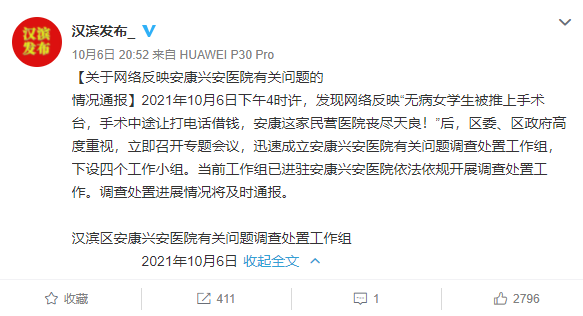 对此,10月6日,陕西省安康市汉滨区通过官方微博回应称,发现网络反映“无病女学生被推上手术台,手术中途让打电话借钱,安康这家民营医院丧尽天良!”后,区委、区政府高度重视,立即召开专题会议,迅速成立安康兴安医院有关问题调查处置工作组,下设四个工作小组。当前工作组已进驻安康兴安医院依法依规开展调查处置工作。调查处置进展情况将及时通报。