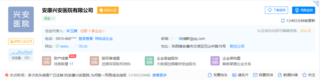 天眼查信息显示,“安康兴安医院有限公司”和“安康兴安医院”实为一家。其一,两者注册地址均为汉滨区巴山中路78号;其二,前述“安康兴安医院”法定代表人“林淑豪”曾为“安康兴安医院有限公司”高管,今年4月刚刚退出;“安康兴安医院有限公司”副总经理吴剑波,曾是安康市文昌门诊部的法定代表人,而该门诊部由前面提及的“林向阳”100%持股。
