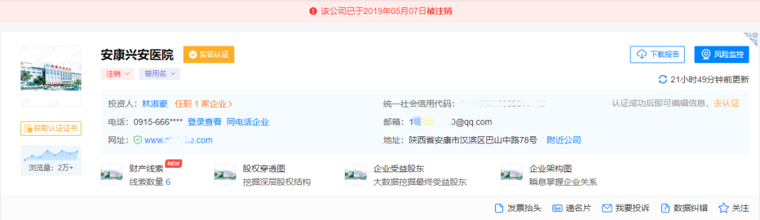 天眼查信息显示,“安康兴安医院”原名为“安康协和医院”,成立于2011年,5年后更名为现在的医院名。其登记地址为汉滨区巴山中路78号,法定代表人为“林淑豪”,唯一投资人为林向阳。不过,“安康兴安医院”已在2019年5月被注销。值得注意的是,其唯一投资人林向阳同时也是安康市协和医院有限公司(已注销)、陕西安康新东方医疗管理有限公司、安康华兴妇产医院有限公司的实际控制人。安康市福建商会官网显示,林向阳系该商会副会长,曾当选为政协汉滨区十三届委员、汉滨区十八届人大代表。