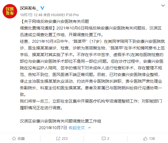 次日中午,汉滨区通报调查结果:经查,2021年10月4日中午,“路某甲”(17岁)在其同学陪同下到安康兴安医院就诊,医生操某某接诊、检查,诊断为宫颈赘生物,“路某甲”在手术知情同意书上签字后,操某某对其实施了手术。不存在手术中签字、虚假手术(在其他医院检查的部位与安康兴安医院手术部位不是同一部位)问题。但在诊疗过程中,安康兴安医院在没有监护人陪同、签字的情况下对未成年人进行检查和手术,存在管理不规范、告知不到位、医风医德不端正等问题。
