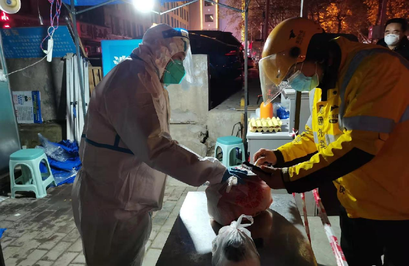 “你站在线外,写上房号,我给你送…”、“你让对方招个手,我给你送…”这样的对话,在小区门口10米的安全通道里反复上演,身穿隔离服手拎物资的身影来回穿梭。