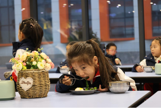 做成小猪模样的包子、清脆爽口的芥菜拌黄豆、暖呼呼的鸡蛋醪糟汤圆……开学第一顿早餐,成功捕获了“小小美食家们”的味蕾,同学们吃的津津有味,还有部分同学意犹未尽,决定“再来一碗”。