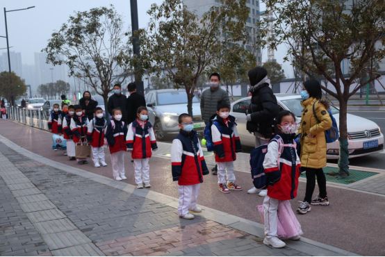 清晨,值周教师、值周领导、值周教师早早来到校门口,迎接同学们的到来,交通疏导员、家长志愿者和交警也在校门口疏导交通。从入校一米间距排队测温到入班体温复测和手消,每个环节同学们都自觉戴好口罩,做校园安全小卫士。