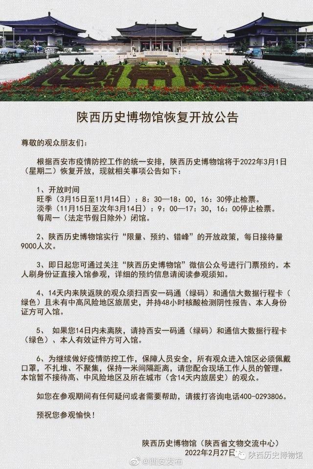 陕西历史博物馆今日(27日)发布公告,根据西安市疫情防控工作的统一安排,陕西历史博物馆将于2022年3月1日(星期二)恢复开放。