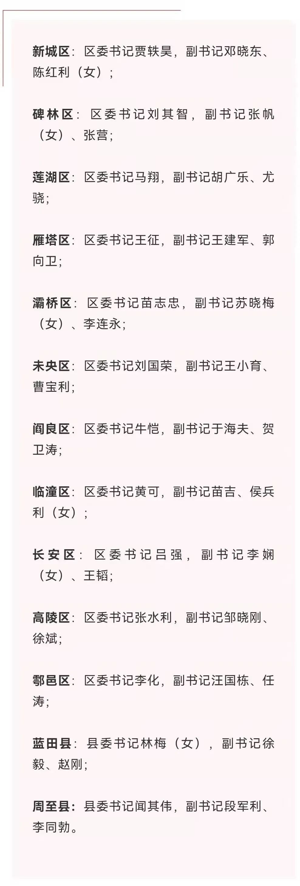 近日,西安市13区县集中召开党代会,选举产生新一届区县党委领导班子,其中: 书记13名、副书记26名、常委143名。