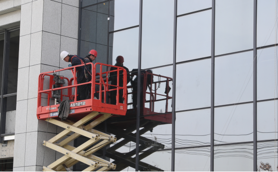 位于润丰路以南、乾元路以东的西安汉易通讯产业园项目建设已具雏形,办公综合大楼主体已经完工,工人们正在进行外立面清洁施工。