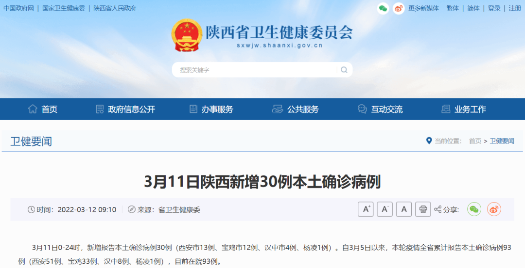 3月11日0-24时, 新增报告本土确诊病例30例(西安市13例、宝鸡市12例、汉中市4例、杨凌1例)。自3月5日以来,本轮疫情全省累计报告本土确诊病例93例(西安51例、宝鸡33例、汉中8例、杨凌1例),目前在院93例。