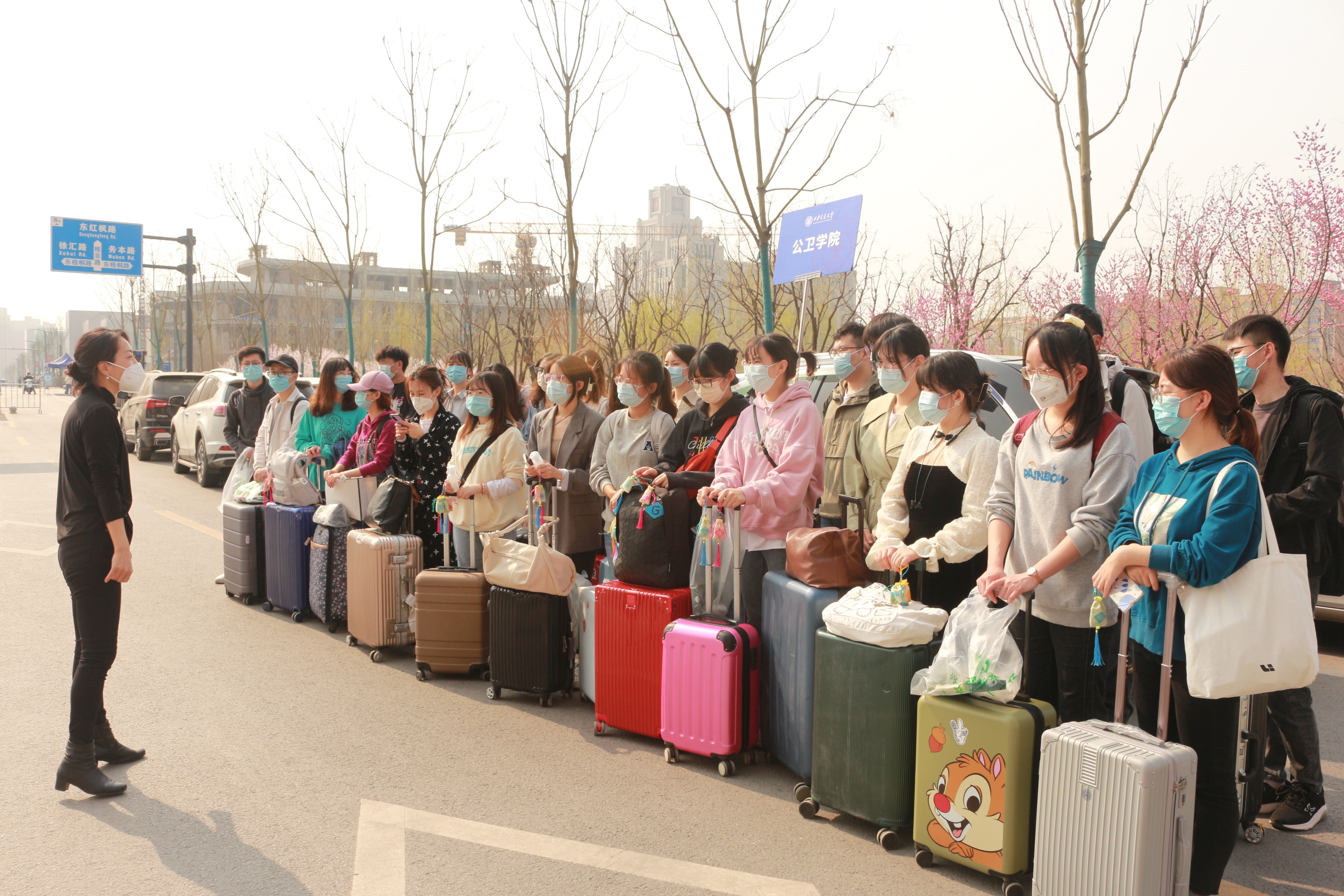 3月11日,由罗小琴副教授带队的26名流调队员迅速集结,启程进驻疫情防控指挥部。公共卫生学院党委副书记岳甜为流调队送行鼓劲,传达学校党委、医学部党委和学院党委的嘱托和要求,同时给同学们发放了口罩、手消、中药香囊等抗疫物资。一袋袋中药香囊,满载对同学们的关怀和牵挂,传递着爱心、信心与力量,希望同学们圆满完成任务,平安归来。