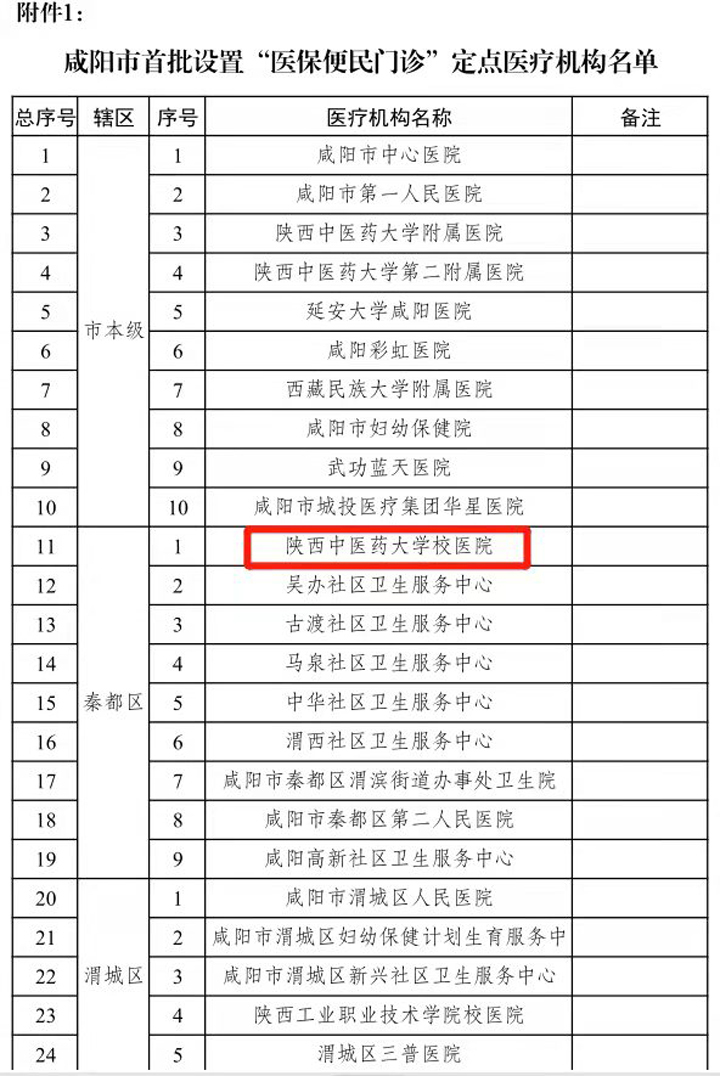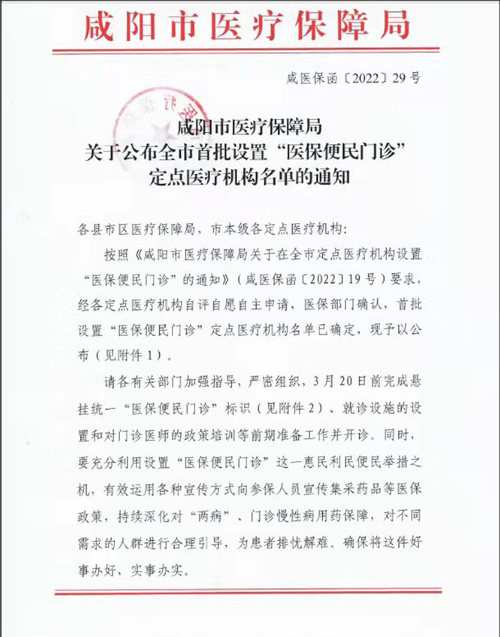 近日,从《咸阳市医疗保障局关于在全市定点医疗机构设置“医保便民门诊”的通知》(咸医保函〔2022〕19号)获悉,经咸阳市医疗保障局审批,陕西中医药大学校医院成功入选咸阳市首批设置“医保便民门诊”定点医疗机构。