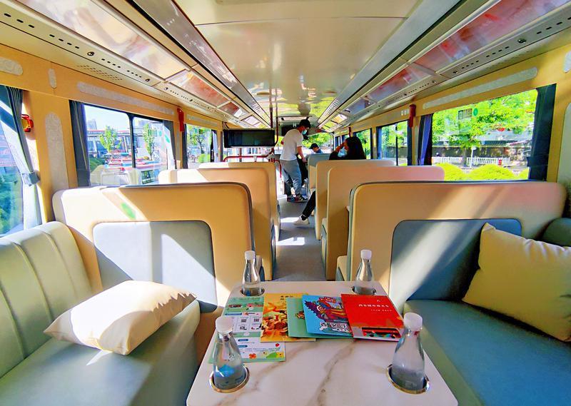“西安城市观光车”统一选用双层观光巴士。外观以大雁塔等西安标志性旅游元素进行装饰,具有鲜明个性的视觉效果。内部进行功能分区:一层为“共享体验区”,布设有陕西文创、各地土特产、历史文化书籍、古装服饰和各种饮品售卖,丰富多样的文创产品都能在车上选购;二层为“观光体验区”,居高临下的全方位观景视野和舒适座椅,给游客创造舒适空间。车上也设有行李放置区和残疾人轮椅区。