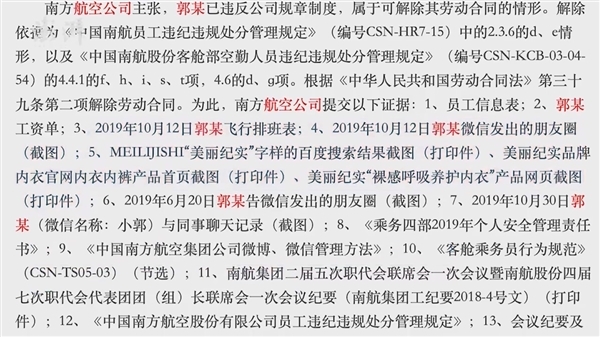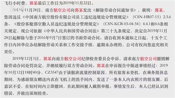 2019年11月28日,南方航空以郭某利用工作时间从事私人事务,违反公司舆情管理、网络管理规定,在网络发布不雅照片违反公序良俗造成不良影响为由,与郭某解除劳动合同。