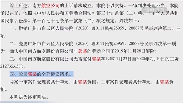 案件判决结果显示,确认中国南方航空股份有限公司与郭某的劳动合同于2019年11月28日解除,南方航空股东无需支付郭某2019年11月23日至2020年7月10日工资212735.63元,驳回郭某全部诉讼请求,本判决为终审判决。