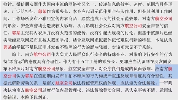 二审判决书裁定,作为有15年工龄的乘务长,郭某更加应当认识到在朋友圈发布不雅照片对南方航空公司形象、航空安全声誉、对公序良俗造成的负面影响,故南方航空公司认为郭某在值勤期内发布自拍不雅照的行为构成严重违反规章制度具有合理性,其据此解除劳动关系,是南方航空公司依法行使管理权的体现,应认定为合法解除。
