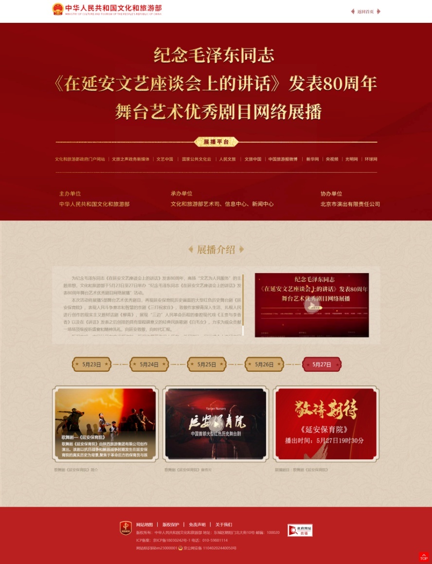 为纪念毛泽东同志《在延安文艺座谈会上的讲话》发表80周年,高扬“文艺为人民服务”的主题思想,文化和旅游部于5月23日至27日举办“纪念毛泽东同志《在延安文艺座谈会上的讲话》发表80周年舞台艺术优秀剧目网络展播”活动。